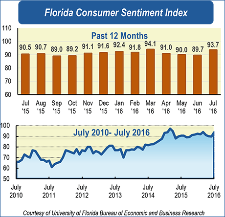 GAINESVILLE, Fla. --- Consumer sentiment among Floridians increased in July to 93.7, according to the latest University of Florida consumer survey.