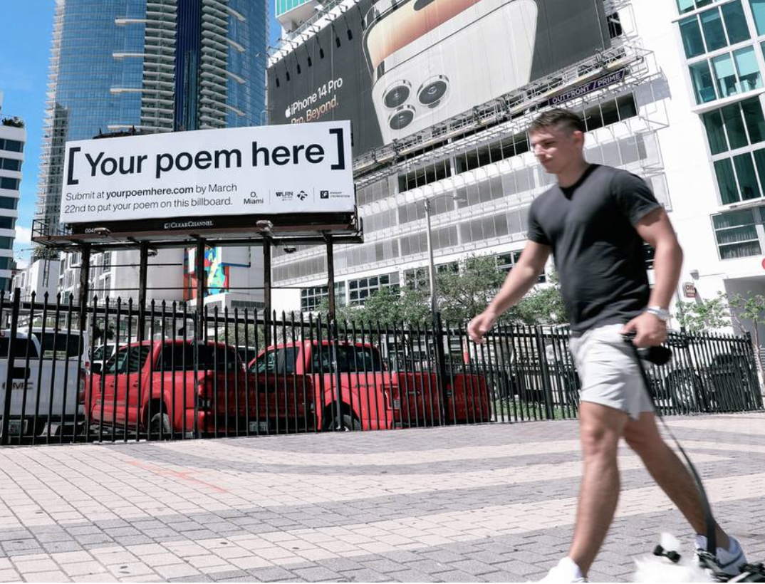 You don’t have to be Shakespeare for your poem to be read by millions. All you need is a downtown Miami billboard. O, Miami, the nonprofit that organizes poetry programs, launched a new [Your Poem Here] poetry contest in partnership with WLRN Public Media this week ahead of this year’s O, Miami poetry festival in April, which is National Poetry Month. The winning Miami-inspired poem will be displayed on a billboard just across the street from the Miami Heat arena downtown.