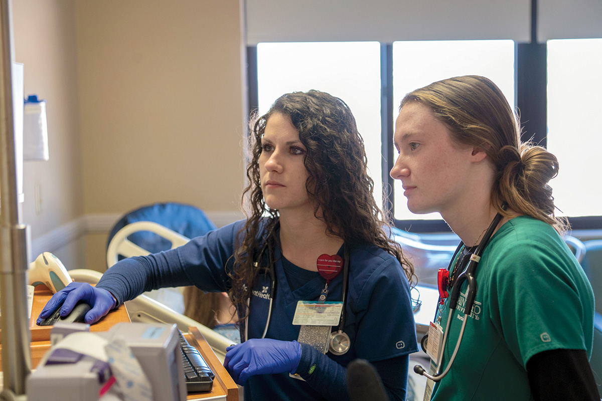 Last spring, the nursing program formed a Dedicated Education Unit with AdventHealth Zephyrhills. In the traditional clinical model, nursing mentors are spread between eight nursing students, and each student is assigned to one patient. With Saint Leo’s model, students work alongside nurses with their entire caseload of patients for 12-hour shifts. The partnership expanded this year to include AdventHealth Dade City.